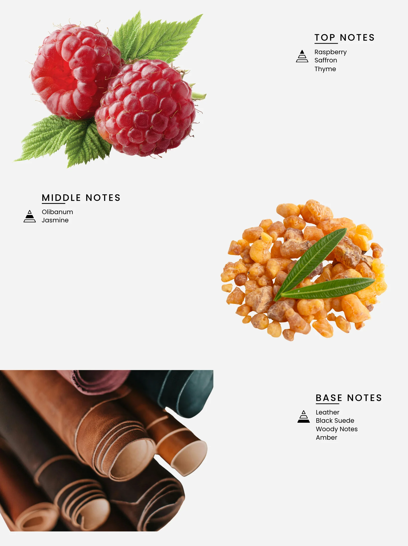 Black Hide opens with raspberry, saffron, and thyme — a slightly sweet yet spicy introduction that feels intriguing. The heart blends olibanum and jasmine, adding a smoky and floral contrast that deepens the composition.