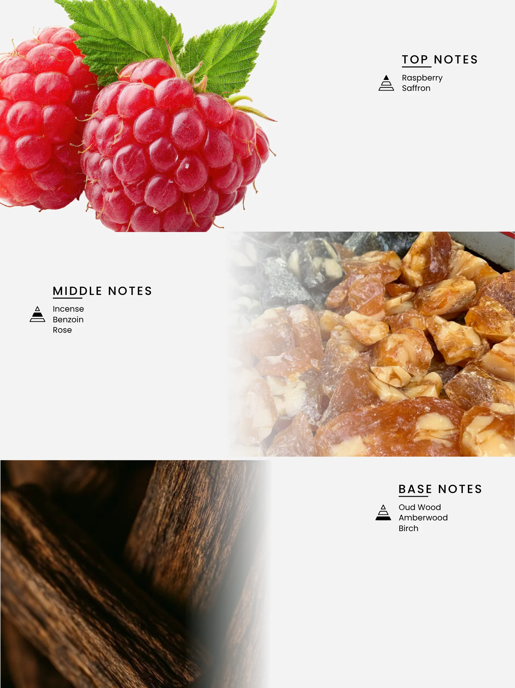 Woud opens with a unique blend of raspberry and saffron, adding a slightly sweet yet spicy introduction. The heart reveals incense, benzoin, and rose, creating a rich, smoky floral depth that feels intense and refined.